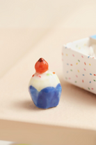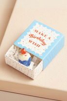 Packaged inside a mini matchbox, a ceramic birthday cupcake is held. Painted in shades of white with a blue casing and a red cherry, this little token is the sweetest trinket. The matchbox sleeve is in a bright blue shade with a confetti label adorned with the wording 'make a birthday wish'. The cupcake comes in a matching confetti-printed casing so it feels like a true birthday treat when they slide open their matchbox.