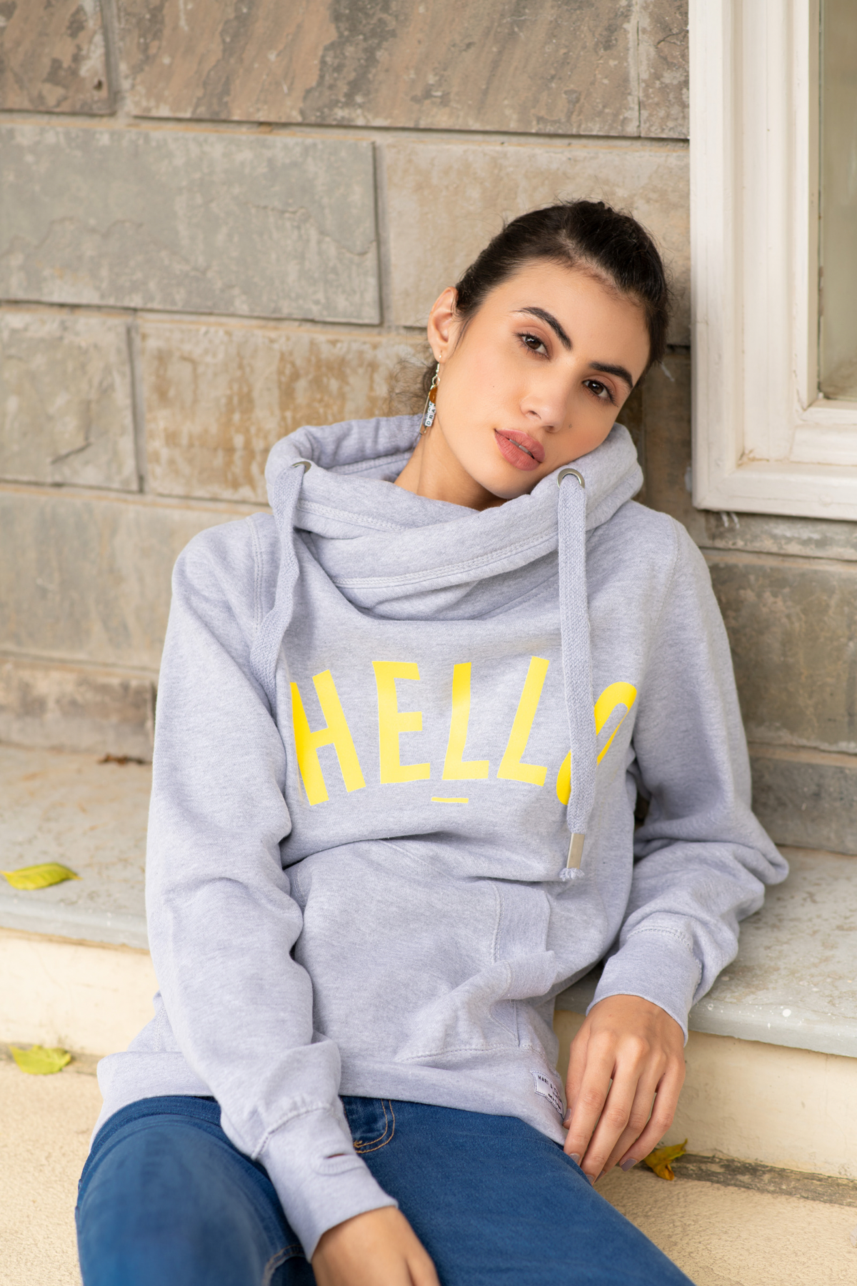 Grey Marl Hoodie. Yellow Print