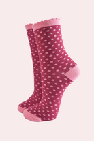 Introducing our Glitter Berry Polka Dot Socks, perfect for spreading some festive cheer this Christmas. These socks sparkle with glitter and feature a luxuriously comfortable scalloped cuff. Plus, they're naturally breathable, keeping your feet cosy all day long. Add some fun and shine to your outfit today!