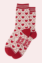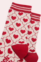 Love You bamboo socks in a soft cream hue featuring classic red love hearts. Made from sustainably sourced bamboo these ankle socks are both breathable and comfortable. Finished with a contrasting striped cuff.